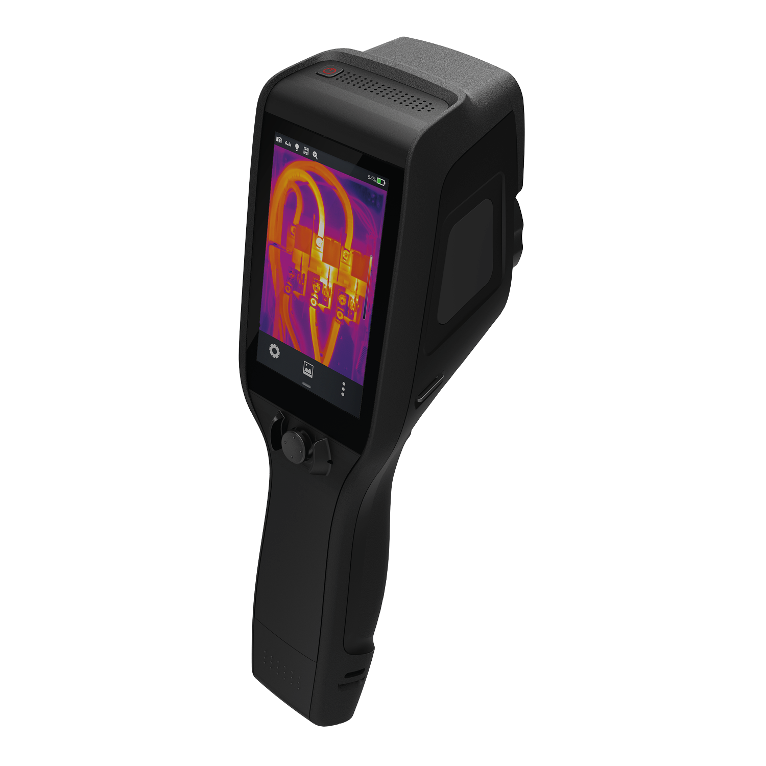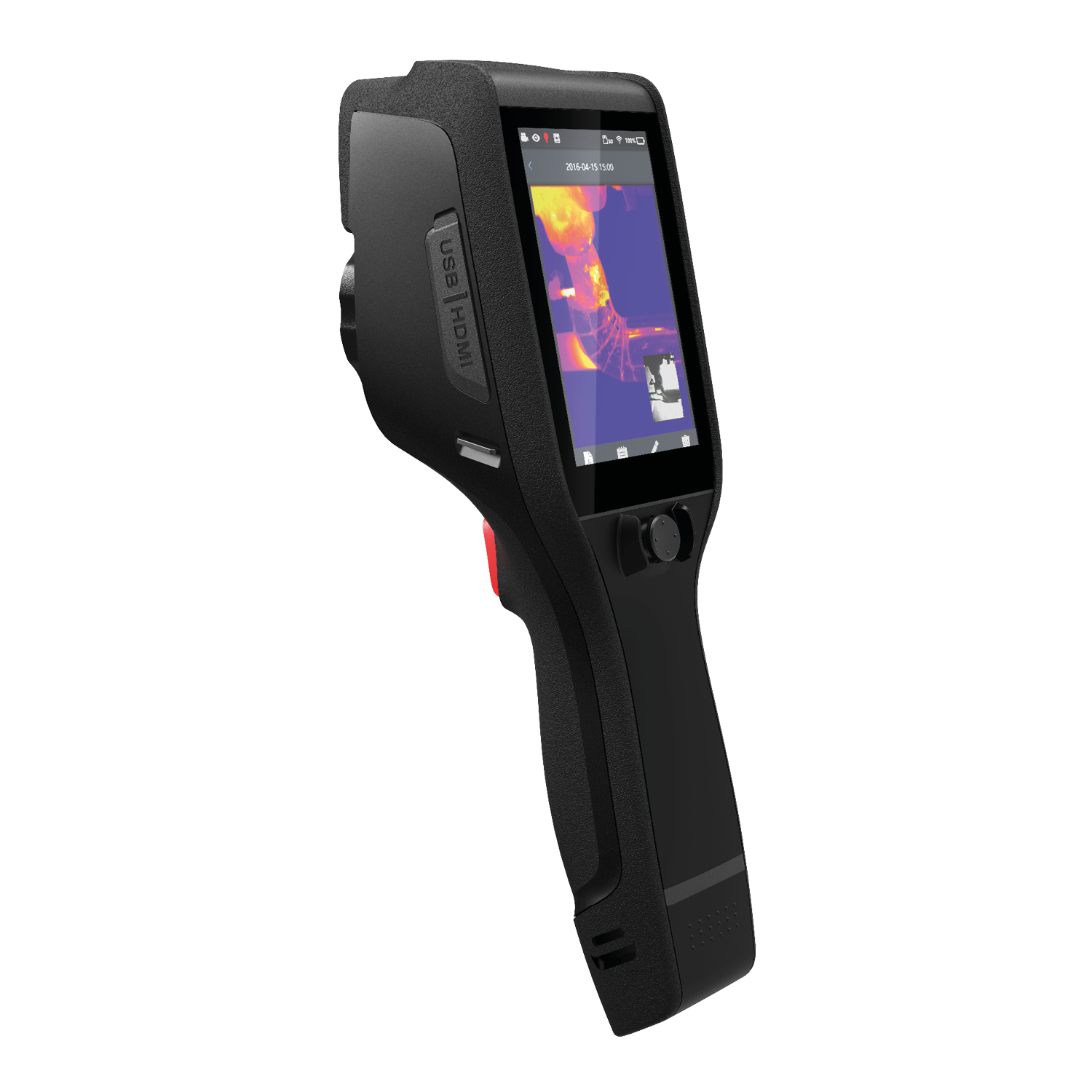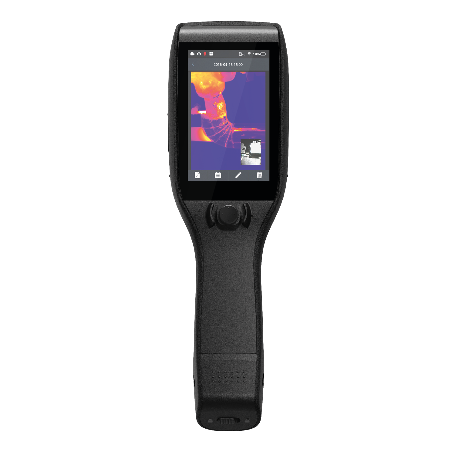 The D384A thermal camera uses a 384×288, 25µm, 45mK NETD thermal sensor with 25Hz frame rate, in combination with a 15mm f1.1 objective lens to present a crystal-clear thermal image onto a 4-inch, 480×800 LCD touchscreen display, with a 1.1x-4x digital zoom available for closer inspection. The D384A’s touchscreen also enables direct on-screen interaction, so the user can make settings changes and access on-board diagnostic tools and functionalities.